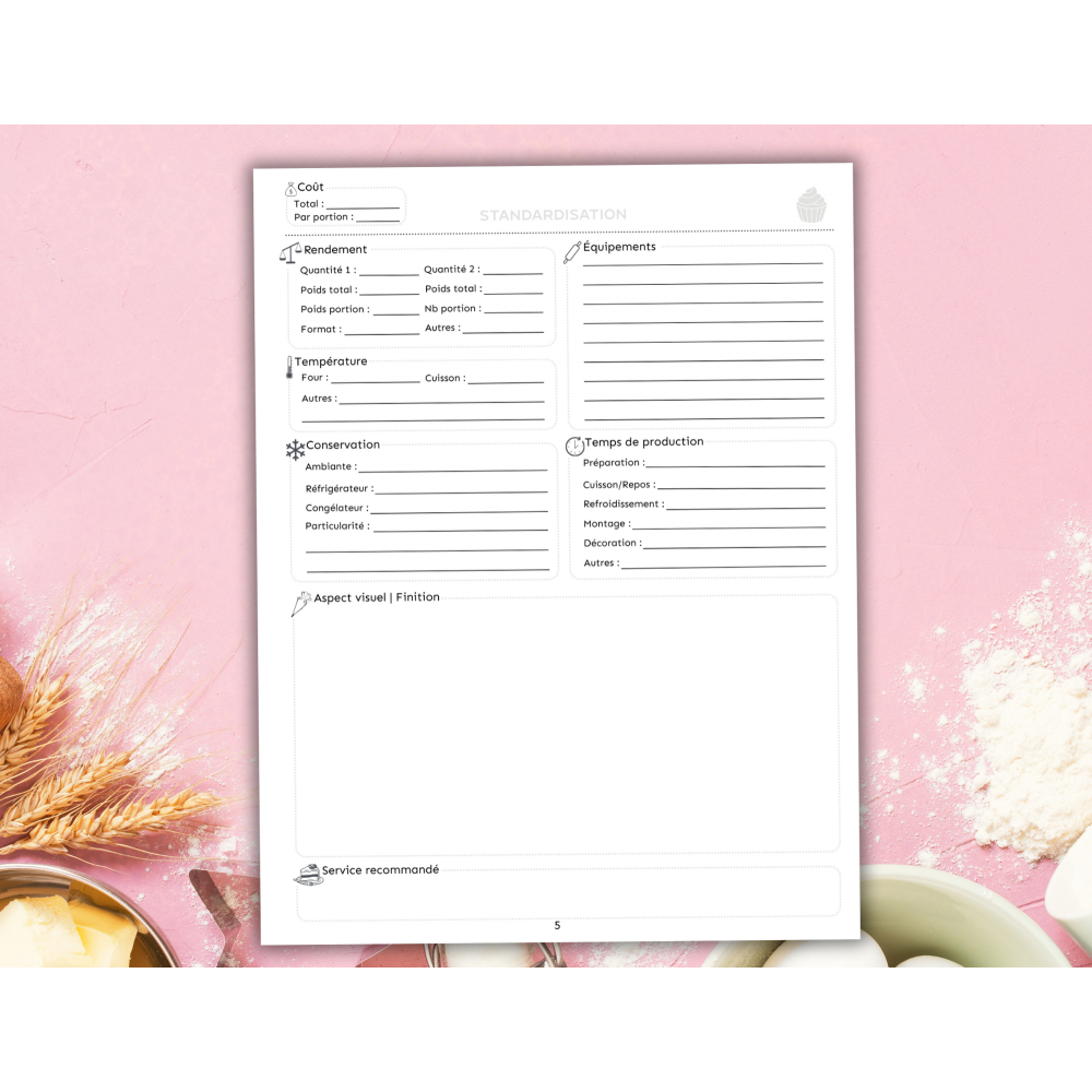Page droite : fiche de standardisation pour détailler les méthodes, rendement, conservation, ajustements, variantes et détails de montage/finition.